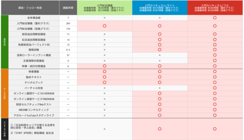 ここでは法律の知識がない受験生が必要最低限で最短コースを想定して入門総合講座を紹介していますが、入門講座としてほかにライトカリキュラムやフルカリキュラムがあり、学習経験者向けに中上級、さらには上級の総合カリキュラムがそれぞれ設定されています。