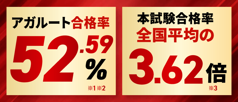 その中で、アガルートの合格率は52.5%、少なくとも半分以上の受講生が合格しています。しっかりと最後までやり切ることで合格にぐっと近づきます。