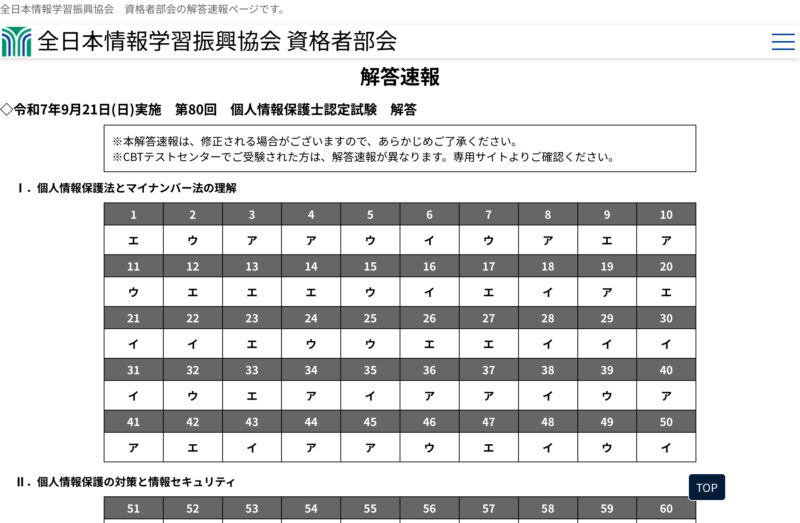 ❶全日本情報学習振興協会【個人情報保護士試験】解答速報