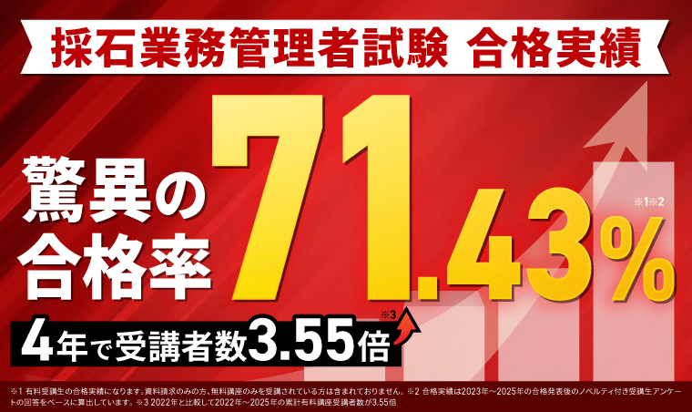 アガルートは出るところだけ学ぶ最短ルートなのに、難関資格の圧倒的な合格率が有名ですね。比較的新しい講座である採石業務管理者も合格実績をグングン伸ばしていますね!