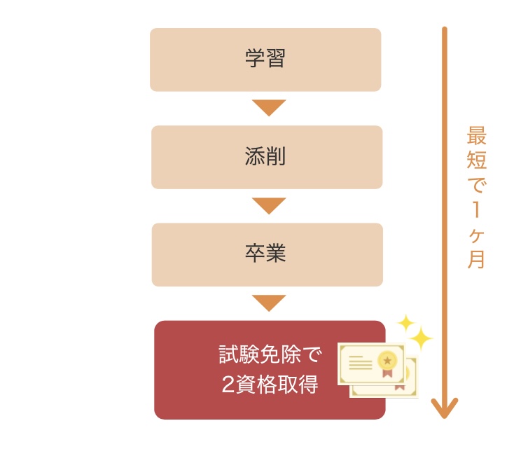 また、講座終了後に資格試験に申し込んで何度も受験して合格するというプロセスが不要!SARAスクールの独自メソッドなら、講座を修了し卒業した時点で一度に2つの資格がまとめて取得できます。資格勉強で疲弊してしまうリスクがなく、人生ステップアップを実現できます。